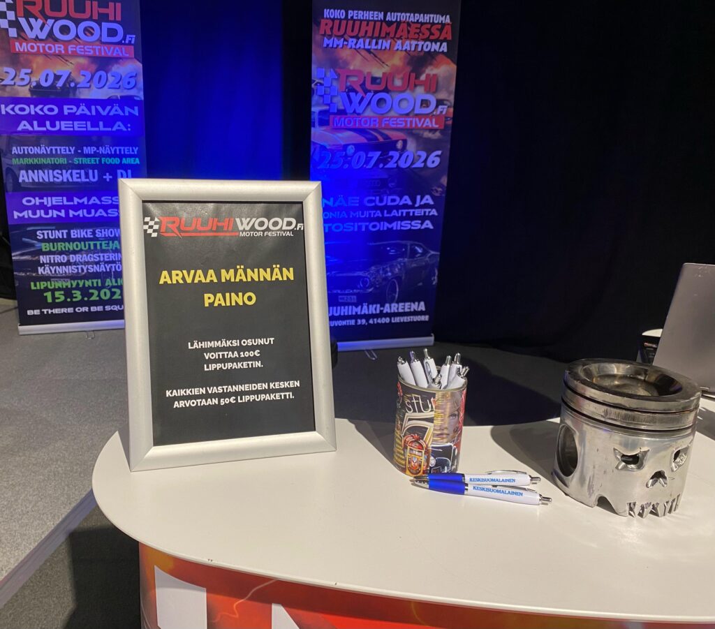Männänpaino-kilpailussa sai arvuutella esillä olleen männän painoa ja parhaiten arvanneelle oli palkintona 100€ arvoinen Liveto-pääsylippupaketti Ruuhiwood Motor Festival 2026 –tapahtumaan. Lisäksi kaikkien osallistuneiden kesken arpajaispalkintona oli yksi 50€ pääsylippupaketti.